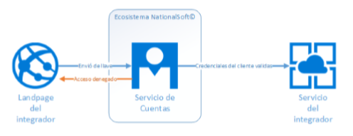 Como se puede observar en el diagrama anterior el servicio de cuentas válida las credenciales y permite o denega el acceso del usuario a la aplicación integradora. Después del inicio de sesión, el servicio de cuentas devuelve información de la sesión del usuario, posteriormente debe consumirse el sevicio api/User/Logged para obtener la información del usuario que inicio sesión.